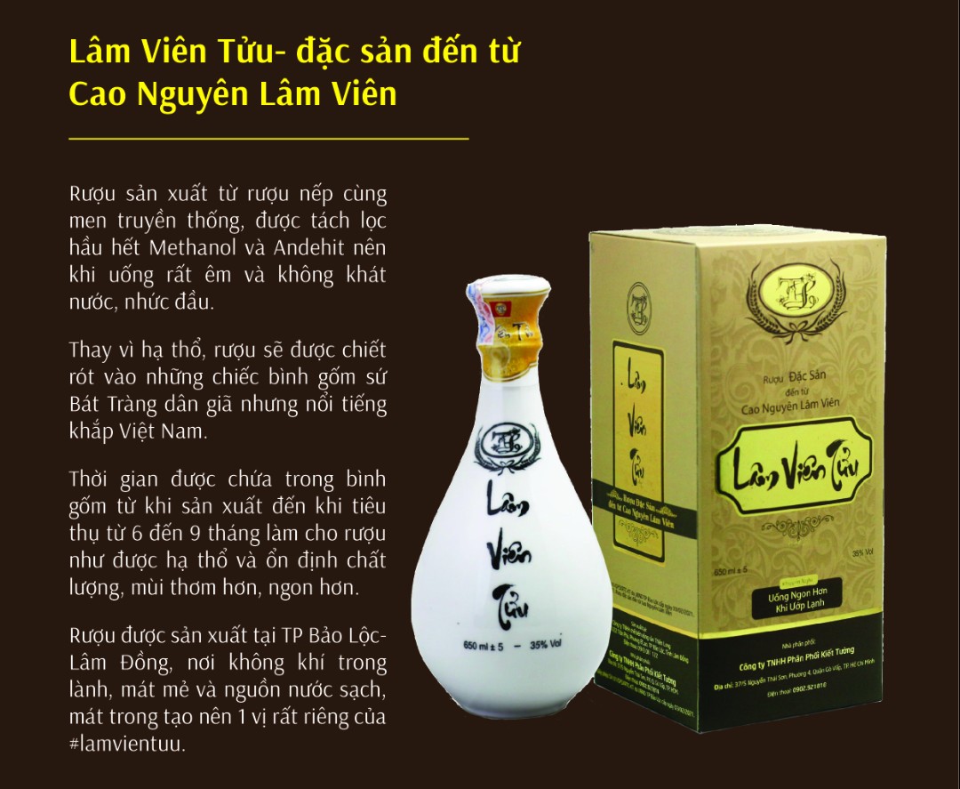 Rượu Lâm Viên Tửu được sản xuất từ rượu nếp cùng men truyền thống, được tách lọc hầu hết Methanol và Andehit nên khi uống rất êm và không khát nước, không nhức đầu. Thay vì hạ thổ, rượu sẽ được chiết rót vào những chiếc bình gốm sứ Bát Tràng dân giã nhưng nổi tiếng khắp Việt Nam.
